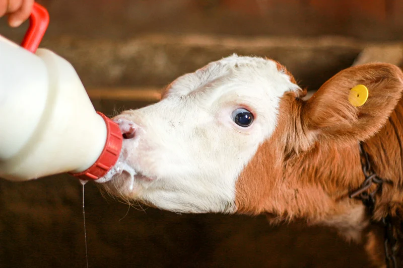 Le veau avait un jour, et il venait d’être enlevé à sa mère. Le biberon contenait du lait artificiel, le lait de sa mère étant utilisé pour la production.